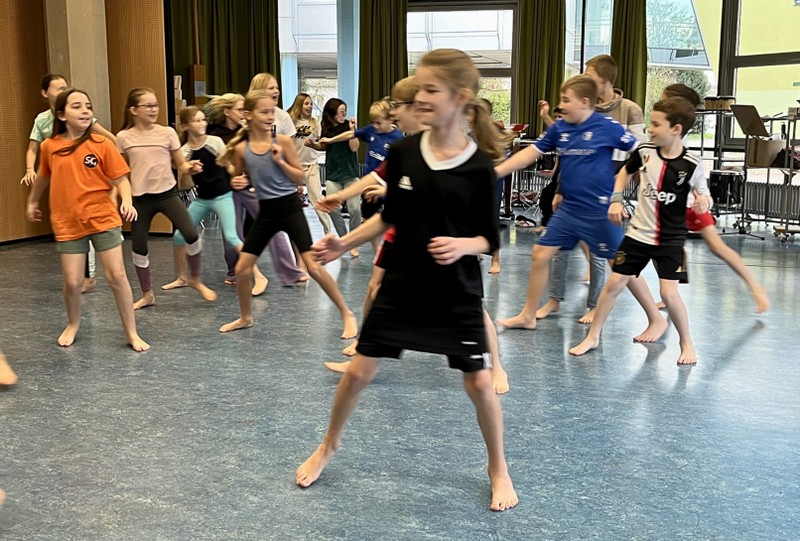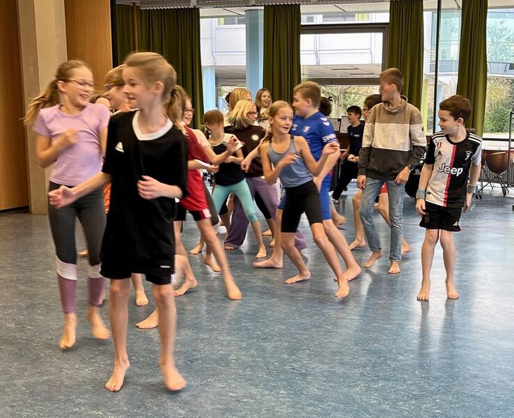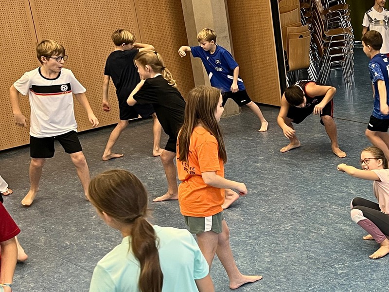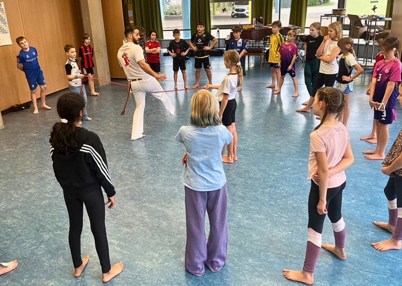 Und so lernen wir bei Cao in zwei Doppelstunden einige Angriffsschritte und Abwehrreaktionen, mal im Kreis, mal zu zweit, mal zu dritt, mal mit Drehung und mal ohne, mal mit einem Seil und mal ohne. Manche Übungen fallen uns ziemlich schwer, da sie koordinativ anspruchsvoll sind und eigentlich mehr Übungszeit benötigen, als wir zur Verfügung haben. Aber wir erhalten einen guten Einblick in diese Sportart und am Ende sind einige von uns daran interessiert, noch weitere Capoeira-Techniken zu lernen. Deswegen gibt Cao jedem, der interessiert ist, noch ein Kärtchen mit. Im Turnverein in Staffort kann man nämlich einmal die Woche bei Cao trainieren.
