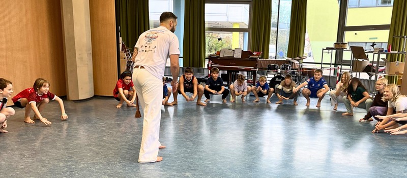 Über die sportlichen Techniken hinaus haben wir von Cao aber vor allem gelernt, wie wir uns gegenseitig respektieren können. Es gehöre beispielsweise mehr Mut dazu, etwas zu zeigen, was man noch nicht könne, als etwas vorzuführen, von dem man wisse, dass man es gut kann. Und jemanden auszulachen, der das erste Mal etwas ausprobiere und es deswegen vielleicht noch nicht so gut könne, führe nur dazu, dass man es in Zukunft lieber erst gar nicht mehr versuche. Außerdem erinnert uns Cao daran, dass jeder von uns irgendetwas zunächst noch nicht gut gekonnt habe und es deswegen ein erstes Mal habe ausprobieren müssen. Das leuchtet uns allen ein und so begleiten wir uns alle gegenseitig kurz vor Schluss mit rhythmischem Klatschen beim Vorführen eines „AU“, eines Capoeira-Rades, in allen möglichen Niveaustufen. Das kostet manche von uns viel Überwindung. Und nachdem es geschafft ist, rufen wir alle ganz laut „Capoeira!“