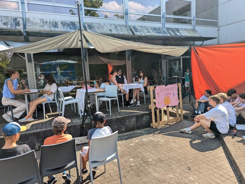 Am Samstag folgte der letzte Teil des Schuljubiläums, das Treffen der Ehemaligen, das von Herrn Wallaschek und Patrick Krause organisiert worden war. Das Wetter ließ alle etwas leiden, aber der deutlich kleinere Rahmen und die ruhigere Atmosphäre boten Gelegenheit zum Austausch. Es kam zu intensiven Gesprächen zwischen Ehemaligen, Schülern wie Lehrern, sowie aktiven Lehrern. Was hatten sich die „Kinder“ in den letzten Jahren aber auch verändert! In Gedanken waren sie noch in der Unterstufe oder beim Abitur, aber inzwischen … Gestandene Männer und Frauen konnten aus ihrem Leben berichten! Es war schön zu erfahren, wie sie ihren Weg bereits gefunden hatten oder noch auf der Suche waren. Erinnerungen wurden ausgetauscht und besondere Freude machte es, von den „Kindern“ zu hören, dass es ihnen damals im Unterricht auch gefallen hat, Schule also nicht nur schrecklich war, und, besonders, an welche Einzelheiten sie sich erinnerten. So gab es viel Gelegenheiten zum Lachen!