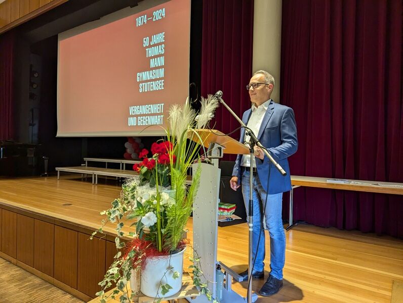 Studiendirektor Florian Schuller ergriff für die Schulaufsichtsbehörde das Wort. Er sieht das Anwachsen des TMG von anfänglich geplanter Dreizügigkeit auf inzwischen sich deutlich abzeichnender Fünfzügigkeit als Spiegel des Erfolgs der Schule. Die Basis für diesen Erfolg macht er an der Grundhaltung aller am Schulleben beteiligten fest, an deren festen Verbundenheit mit der Schule und der Bereitschaft zum konstruktiven Miteinander.