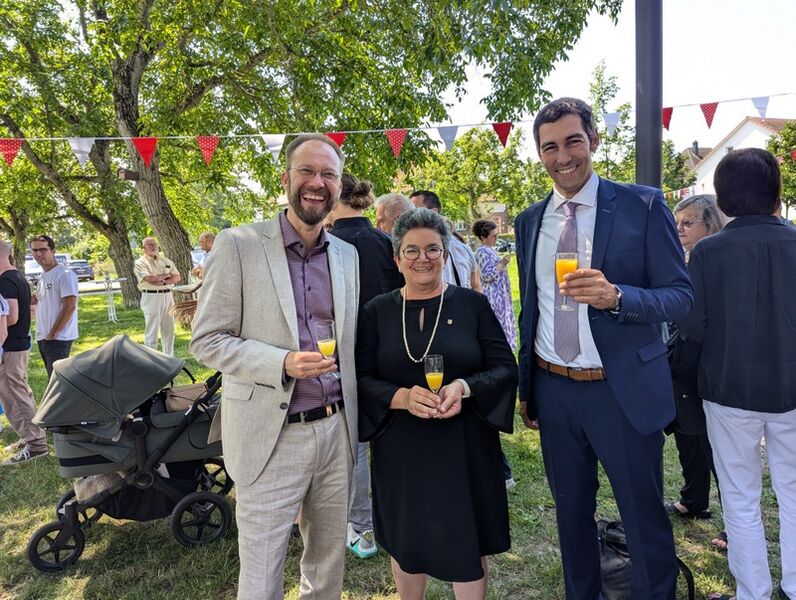 Mit einem anderen Blickwinkel auf das TMG trat Direktor Jörg Reinmuth, Seminarleiter SAF Karlsruhe, ans Mikrofon. Einerseits ist er ehemaliger Lehrer des TMG, andererseits ist er inzwischen für die Ausbildung der heranwachsenden Lehrergenerationen zuständig. Er lobte das TMG als Ausbildungsschule mit guter, fachkundiger Betreuung, die den Praktikanten und Referendaren am TMG zuteilwird. Oft kommt es vor, dass sich ehemalige Praktikanten darum bemühen, im Referendariat wieder ans TMG zu kommen. Das TMG als Ort des Lernens zu sehen, war Oberbürgermeistern Petra Becker, Stadt Stutensee, ein besonderes Anliegen. Sie verwies auf die Bemühungen der Stadt, die baulichen Maßnahmen, die angesichts der steigenden Schülerzahlen immer dringlicher werden, voranzutreiben: Das TMG soll für die Schüler und Schülerinnen ein moderner Ort zum Lernen sein. Aus den Grußworten von Bürgermeister Eric Bänzinger, Gemeinde Weingarten, sprach seine Anerkennung für den Erfolg des TMG, auf das viele Kinder aus Weingarten gehen. Es war auch etwas Neid herauszuhören, dass „damals“ diese Schule nicht in Weingarten gebaut worden ist.