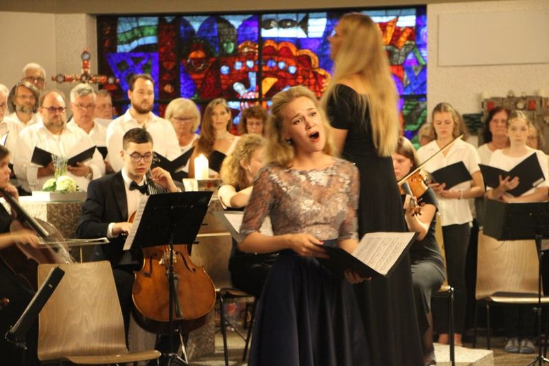 Der Chor gestaltete anlässlich seines 20-jährigen Bestehens den Abend zusammen mit dem Jugendkammerorchester Vasiliev Ostrov aus St. Petersburg und vier Solisten: Aleksandra Dunaeva (Sopran), Felicitas Brunke (Alt), Arndt Krueger (Tenor) und Daniel Patewski (Bass). Und auch die Gäste aus Russland hatten ein Jubiläum zu feiern. Vor 20 Jahren war das Jugendkammerorchester zum ersten Mal zu Gast in Stutensee, damals natürlich mit anderen jungen Musikern, aber unter derselben Leitung.
