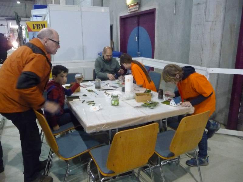 Gleise einschottern, einen kleinen Bausatz von der Fa. Auhagen oder Faller zusammenbauen, mit dem Grasmaster begrünen und einen Baum belauben waren die Grundtätigkeiten, die zum Erfolg führten. Mit viel Kreativität setzten die Teilnehmer die Bestandteile in Szene. Unsere erfahrenen Schülerinnen und Schüler unterstützten die Modellbauneulinge und organisierten den Ansturm auf dieses tolle Event. Dabei machten sie viel Werbung für unserer AG und forderten die Kinder und Jugendlichen auf, ebenfalls in ihren Schulen die Anregung zu geben, auch eine Modellbahn-AGs einzurichten. Daneben hatten unsere AG-Mitglieder Zeit, die Ausstellung anzuschauen.