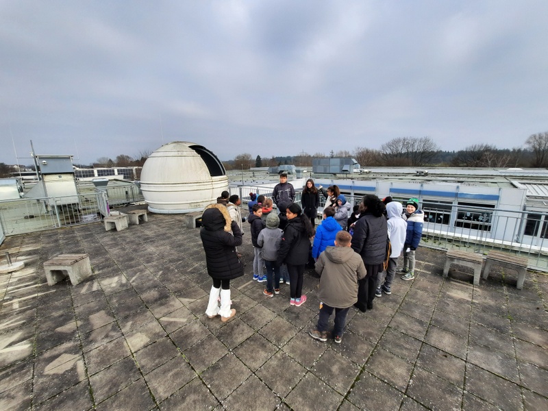 Danach wurden wir in ein leeres Klassenzimmer geführt. Anschließend kamen zwei Schüler der Oberstufe herein, die uns zur Sternwarte des Gymnasiums führen wollten. Wir wurden in zwei Gruppen aufgeteilt. Unsere Gruppe ist zuerst auf das Dach zur Sternwarte, die aussah wie ein gigantischer Golfball, geführt worden. Die Kuppel konnte sich drehen, denn es gab nur eine Öffnung zum Rausgucken. Wir haben dort durch ein riesiges Teleskop geschaut. Nun sind wir wieder in das leere Klassenzimmer gegangen. Wir durften dort durch ein kleineres Teleskop schauen. Dies hat auf einem Tisch gestanden. Danach sind wir wieder auf das Dach gegangen, um ein Foto zu schießen.