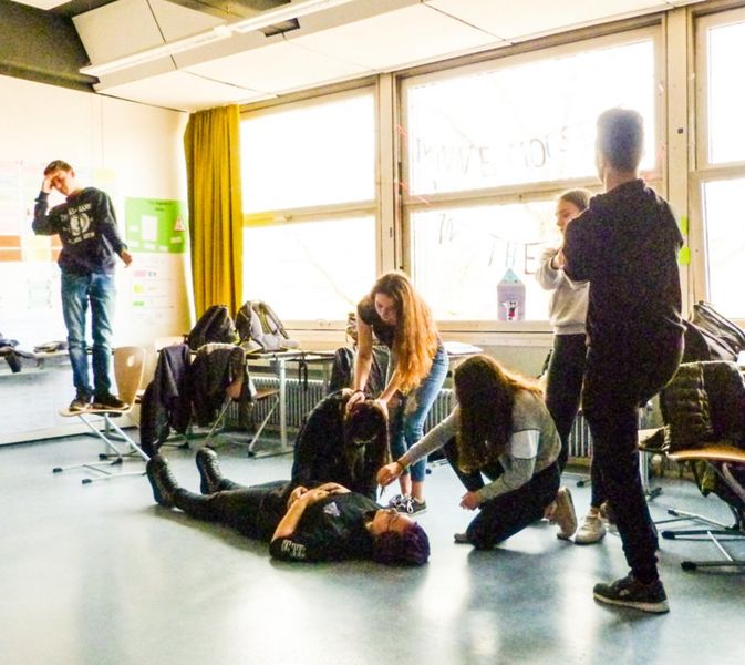 Zunächst erfolgte ein Warm-Up in Kreisaufstellung mit dem Ziel, möglichst spontan, aber effektvoll Stichwörter in Posen umzusetzen. Während der allgemeine „Held“ bei allen SchülerInnen gleich aussah, unterschieden sich die Posen bei der Darstellung von „Mephisto“, „Gretchen“ und „Faust“ immer weiter voneinander. Über verschiedene Aufgabenstellungen schulten sich die SchülerInnen in der Darstellung von Emotionen, die immer auch etwas mit dem Goethes „Faust“ zu tun hatten, bis die Aufgabenstellung immer weiter gefasst und letztlich auch die Inszenierung am Staatstheater mit in die Szenendarstellung einbezogen wurde.
