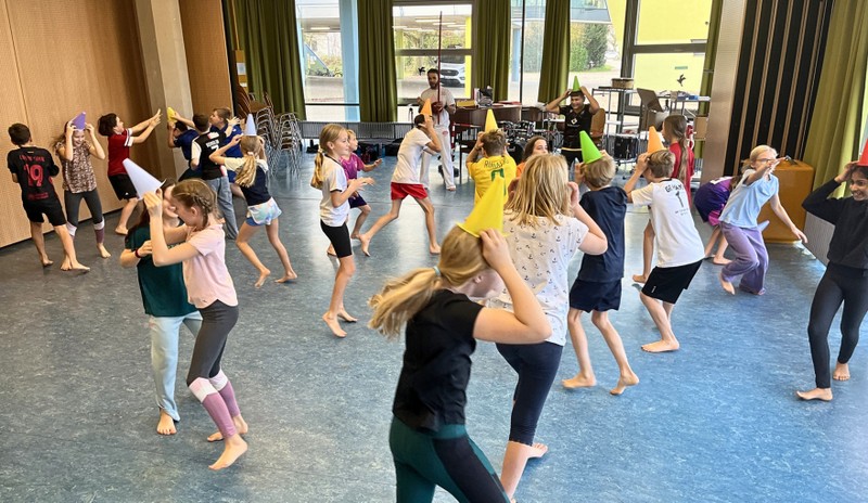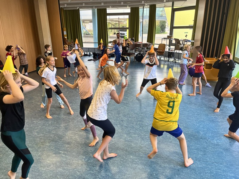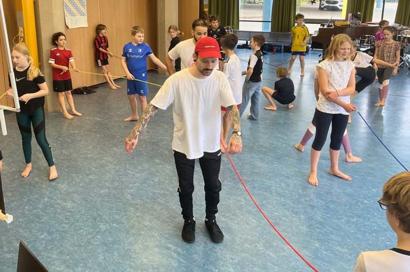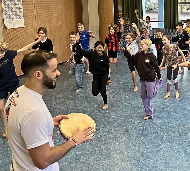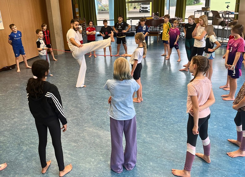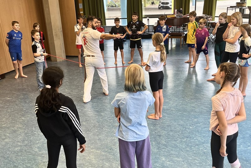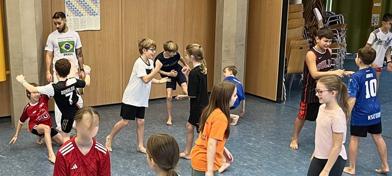 Und so lernen wir bei Cao in zwei Doppelstunden einige Angriffsschritte und Abwehrreaktionen, mal im Kreis, mal zu zweit, mal zu dritt, mal mit Drehung und mal ohne, mal mit einem Seil und mal ohne. Manche Übungen fallen uns ziemlich schwer, da sie koordinativ anspruchsvoll sind und eigentlich mehr Übungszeit benötigen, als wir zur Verfügung haben. Aber wir erhalten einen guten Einblick in diese Sportart und am Ende sind einige von uns daran interessiert, noch weitere Capoeira-Techniken zu lernen. Deswegen gibt Cao jedem, der interessiert ist, noch ein Kärtchen mit. Im Turnverein in Staffort kann man nämlich einmal die Woche bei Cao trainieren.