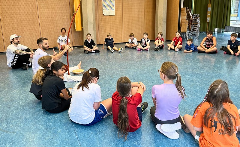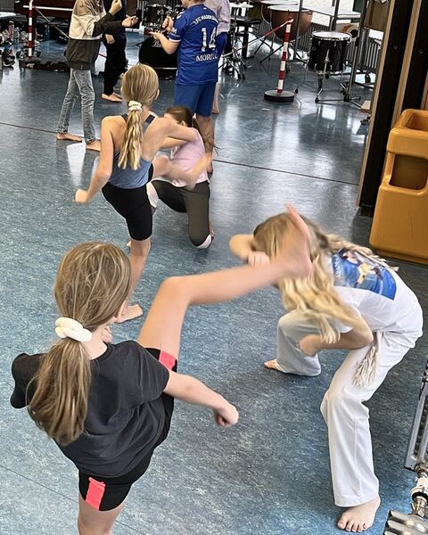 Über die sportlichen Techniken hinaus haben wir von Cao aber vor allem gelernt, wie wir uns gegenseitig respektieren können. Es gehöre beispielsweise mehr Mut dazu, etwas zu zeigen, was man noch nicht könne, als etwas vorzuführen, von dem man wisse, dass man es gut kann. Und jemanden auszulachen, der das erste Mal etwas ausprobiere und es deswegen vielleicht noch nicht so gut könne, führe nur dazu, dass man es in Zukunft lieber erst gar nicht mehr versuche. Außerdem erinnert uns Cao daran, dass jeder von uns irgendetwas zunächst noch nicht gut gekonnt habe und es deswegen ein erstes Mal habe ausprobieren müssen. Das leuchtet uns allen ein und so begleiten wir uns alle gegenseitig kurz vor Schluss mit rhythmischem Klatschen beim Vorführen eines „AU“, eines Capoeira-Rades, in allen möglichen Niveaustufen. Das kostet manche von uns viel Überwindung. Und nachdem es geschafft ist, rufen wir alle ganz laut „Capoeira!“