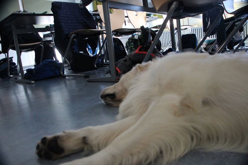 Während die Kinder sich nach und nach an ihre Plätze setzten oder auf den Fußboden zu den Hunden, um ihre Berichte zu schreiben, führte Anne mit einzelnen Schülern und Schülerinnen kurze Interviews zum Thema Schulhund. Zwischendurch waren alle mucksmäuschenstill, damit der Schulgong „eingefangen“ werden konnte. Wie nebenbei werteten die Kinder ihre Arbeitsergebnisse über die Dokumentenkamera aus. Frau Seichter musste Anne ein paar Fragen beantworten. Alle waren konzentriert bei der Sache. Dass die Gesamtsituation vollkommen entspannt war, kann man gut auf den Fotos untern erkennen. George & James waren locker im Klassenzimmer unterwegs, zeigten sich dem Kamerateam gegenüber aufgeschlossen und fanden zwischendurch sogar Zeit zum Dösen.