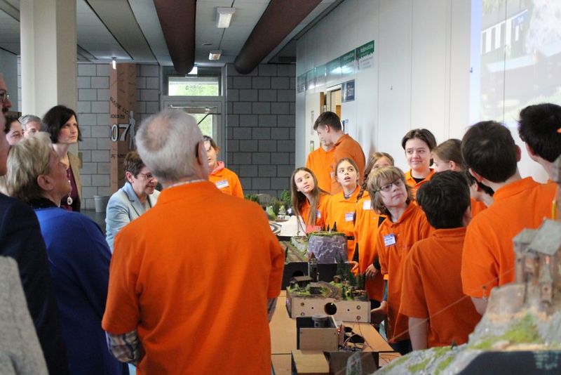 Die Begrüßung der Ministerin durch die eigentliche Hausherrin, Frau OB Becker als höchste Würdenträgerin des Schulträgers, begann just da, wo EKRS und TMG an einem gemeinsamen Gang naturwissenschaftliche Räume haben. Nach einem Besuch der VKL-Klasse der EKRS, in der Schüler und Schülerinnen mit wenig oder gar keinen Deutschkenntnissen auf den Regelunterricht an einer deutschen Schule vorbereitet werden, wurde Halt bei der Modellbahn-AG gemacht. Nicht nur der handwerklich geschickte Bau, die Technik und die Fülle der Details eines kleinen Teils der Gesamtanlage beeindruckte die Ministerin, sondern auch die grenzüberschreitende Kooperation mit ausländischen Gruppen, die dem gleichen Hobby nachgehen.