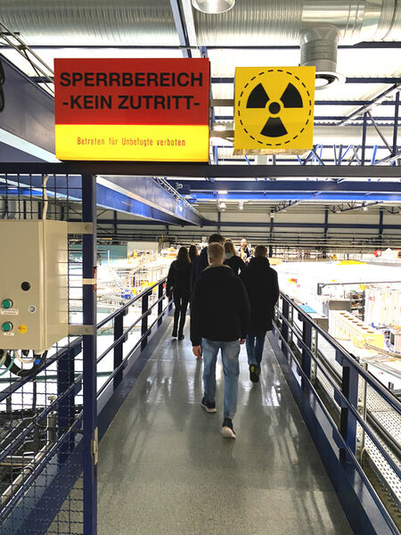 Da der Beschleuniger am Vormittag nicht im Betrieb war, konnten wir die einzelnen Beschleunigungs- und Steuerelemente am Speicherring aus unmittelbarer Nähe betrachten und ein Gefühl für die Größenordnungen – sowohl physikalisch als auch ingenieurstechnisch – bekommen. Ein unglaublich komplexes Unterfangen. Nach einem intensiven Vormittag kamen wir in den Genuss eines weiteren wichtigen Bestandteils des akademischen Lebens: Einem Mittagessen in der Mensa. Frisch gestärkt erreichten wir nach einem kurzen Fußweg entlang dicker Betonwände, die vor hochenergetischer Strahlung abschirmen, das Kontrollzentrum des nun in Betrieb befindlichen Beschleunigers. Mühelos erläuterte Herr Schuh jede Kennlinie die zu sehen war und ließ keine Frage offen, bevor wir auf dem Weg nach draußen noch einen Blick auf mehrere am Ring durchgeführte Experimente erhaschen konnten.