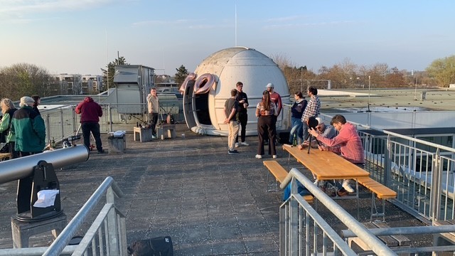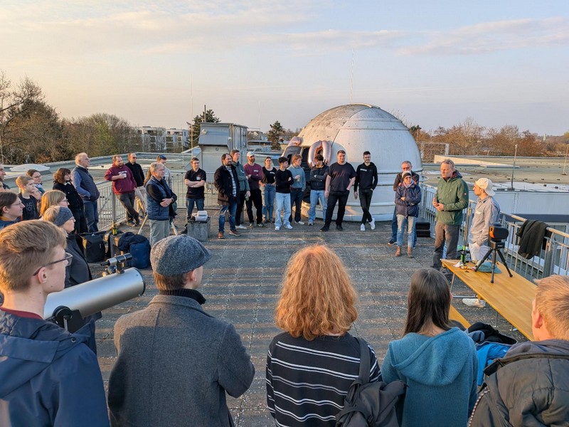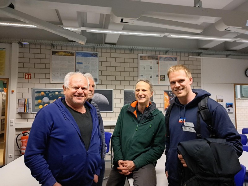 Ein weiteres Highlight des Abends begann ab etwa 20:30 Uhr. Ehemalige der Astro-AG, heute tätig als Wissenschaftlerinnen und Wissenschaftler, als Ingenieure und Ingenieurinnen oder in anderen spannenden Berufsfeldern, berichteten in kurzen Vorträgen über ihren Werdegang. In jeweils 10 (meistens mehr) Minuten spannten sie einen beeindruckenden Bogen von ihren ersten Schritten in der AG bis hin zu aktuellen Projekten und Forschungsfeldern. Die Themenvielfalt war groß: von Theoretischer Physik und Topologie über Astroteilchenphysik und Teilchenphysik, Meteorologie und Meteoritenforschung bis hin zu Satellitenentwicklung, Elektrotechnik, Wasserstoff-Elektrolyse und der Modellierung von Pinguinkolonien. Die Vorträge waren so gut, dass der Zeitplan dezent in Richtung „astronomische Dimensionen“ gedehnt wurde. Danke an alle, die einen Vortrag gehalten haben!
